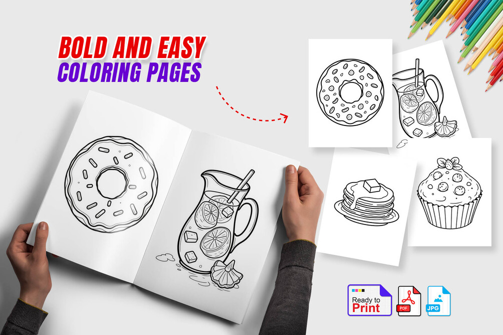 Get ready for a deliciously fun coloring adventure! This 100-page Bold and Easy Food Coloring Pages Bundle is packed with cute, kid-friendly illustrations of burgers, cupcakes, fruits, snacks, and more. Perfect for toddlers, preschoolers, and young children learning to color with confidence!