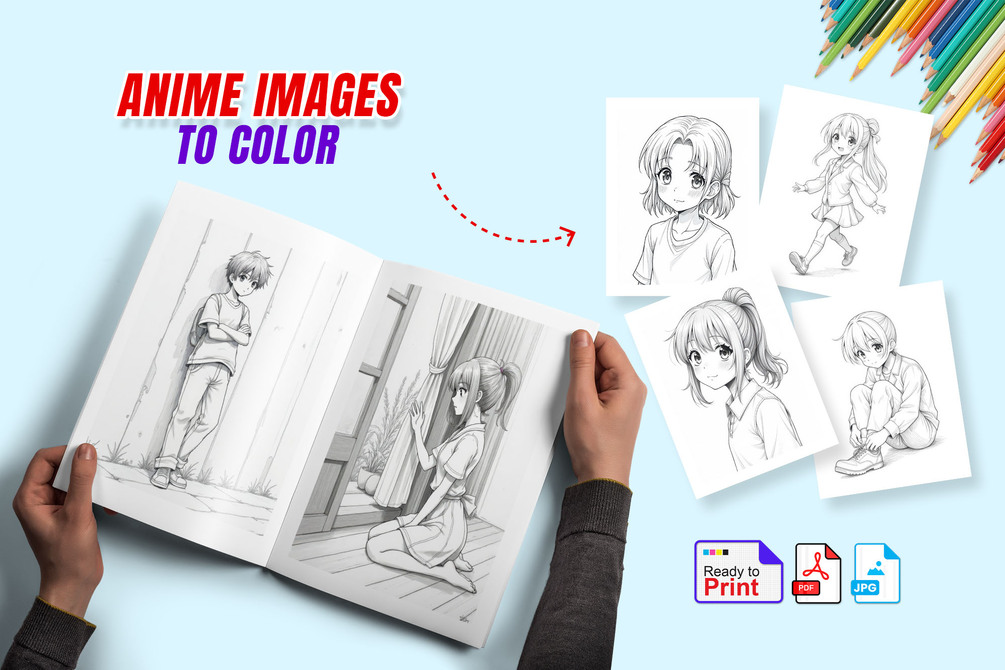 β 100 Unique Coloring Pages β Full-body anime boy & girl illustrations in playful poses